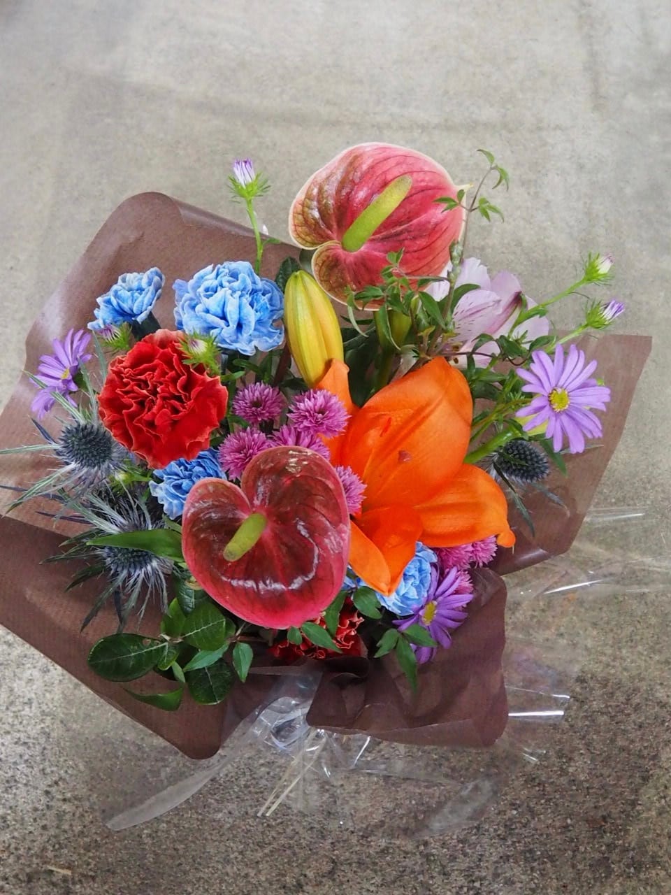 普段より少し大きめなお花を入れてお作りするサイズのアレンジメント